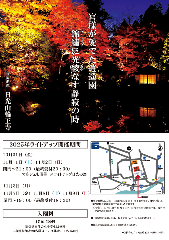 閉門時間(17:00・10月中/16:00・11月中)以降は無料になります。 ※ただし、10月31日~11月2日の3日間は有料ですので、ご注意下さい。 ※駐車台数に限りがございます。 |